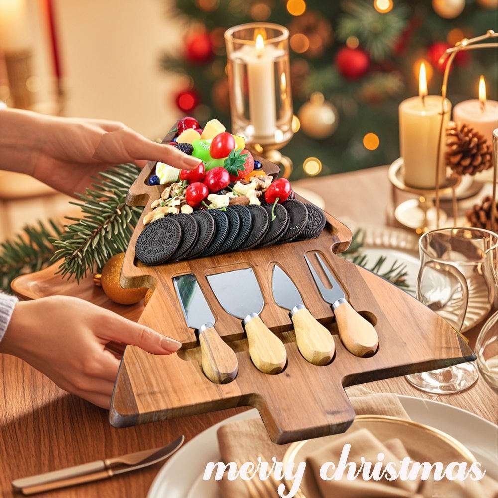 Christmas Style Eco-friendly Natural Bamboo Wood Cheese Boards Set Charcuterie with Utensil Knife Spoon Set for Home Party