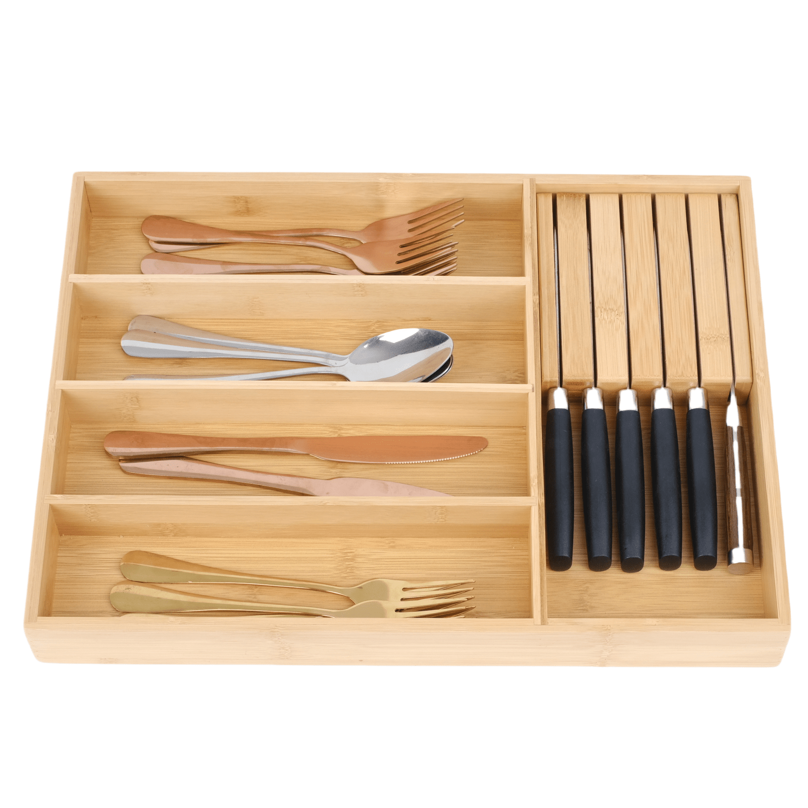 Multifunctional Bamboo Silverware Drawer Organizer Kitchen, Utensil Organizer with Knife Block, Cutlery Tray with Divider