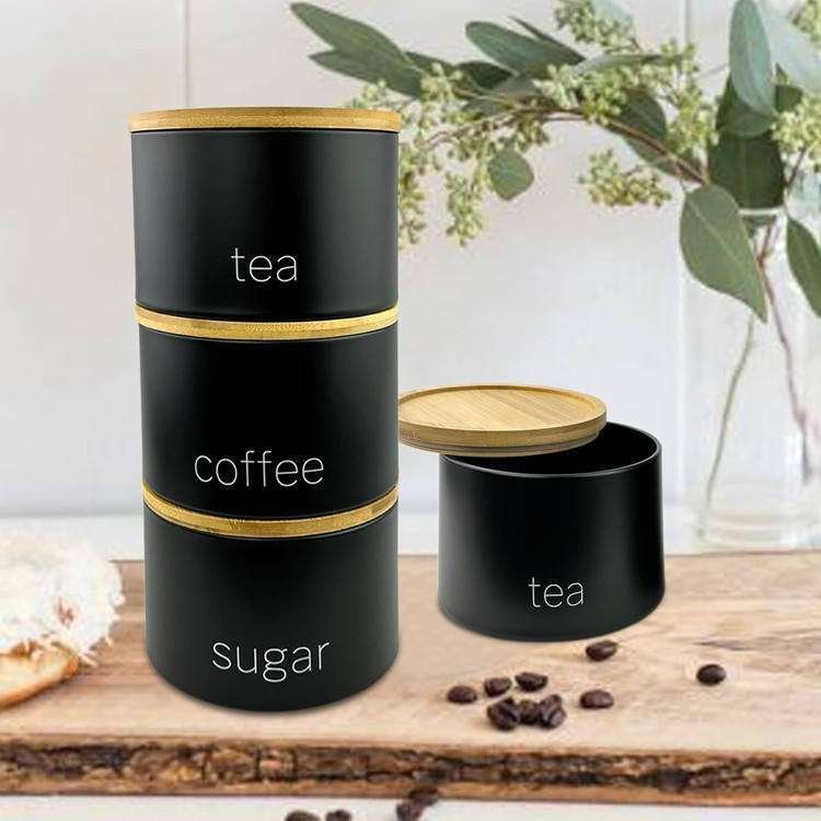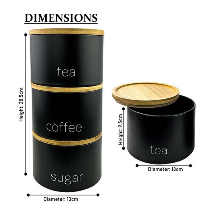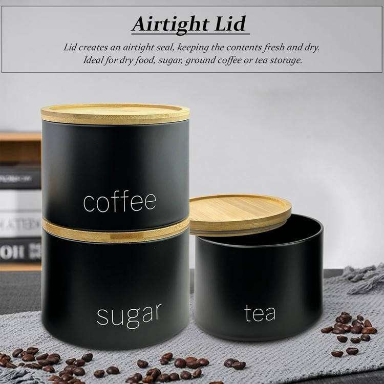 Kitchen Canister Storage Container Bowl Pots Black Metal Tea Coffee Sugar Canisters With Airtight Wooden Lid