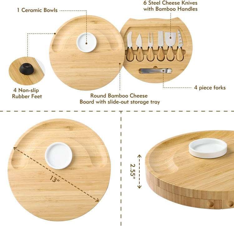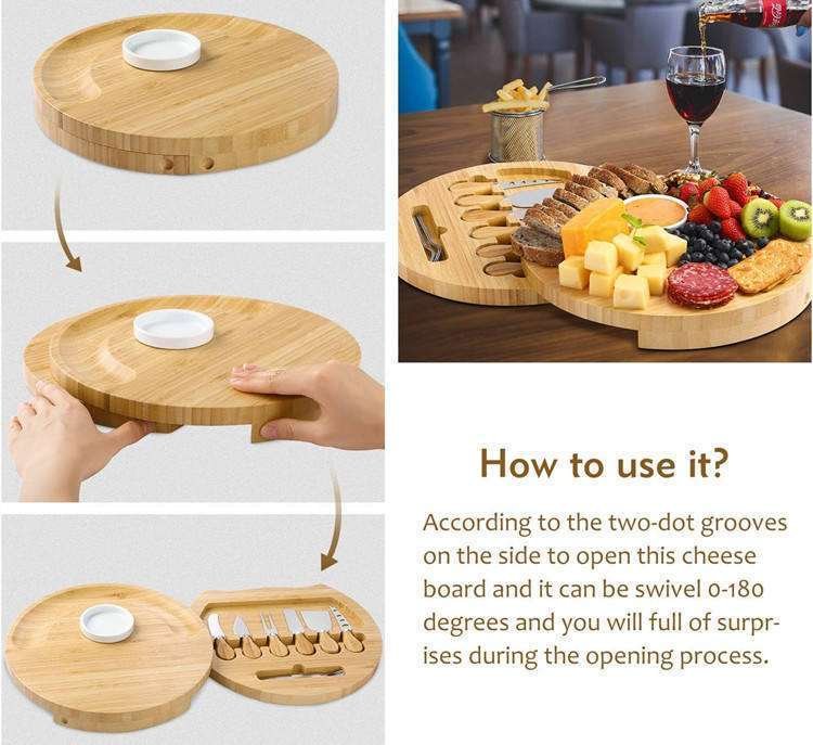 Kitchen Multifunction Round Picnic Wooden Charcuterie Fruit Serving Platter Swivel Bamboo Cheese Board Set