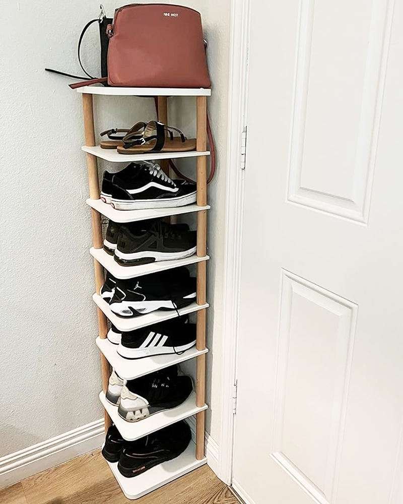 8 Tiers Vertical Narrow Bamboo Tall Shoe Organizer Rack Stylish Wooden Space Saving Shoe Storage Stand