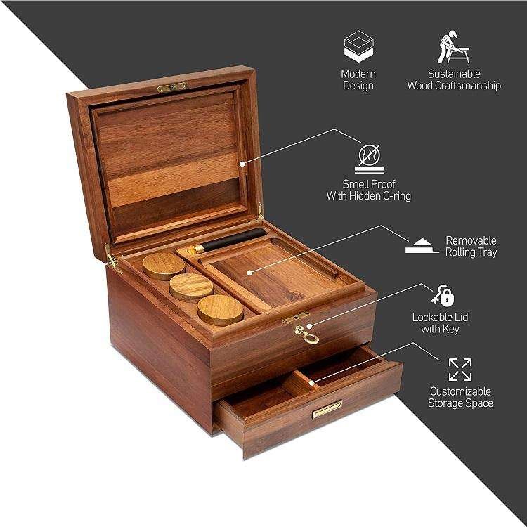 Wholesale Smell Proof Hash Box Rolling Tray Herbs Smoking Kits Storage Acacia Wooden Stash Box With Accessories