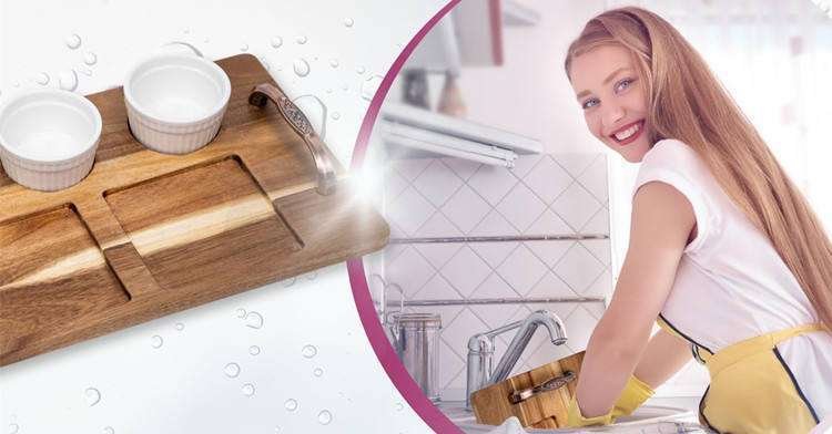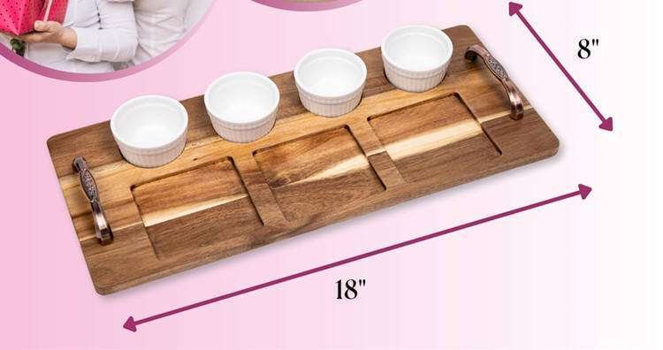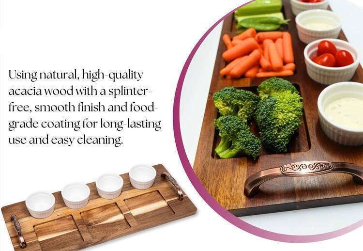 Home Decor Rectangle Large Food Storage Platter Natural Acacia Wood Serving Tray With Metal Handles And 4 Ceramic Bowl