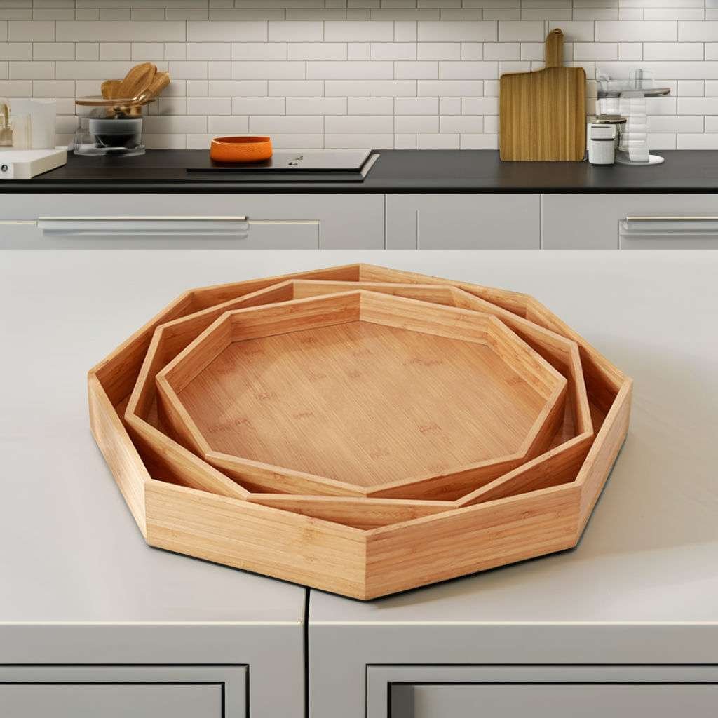 Modern Vintage Farmhouse Hexagon Bamboo Serving Tray Single Carved Kitchen Breakfast Restaurant Lunch Fruit Vegetable Meat