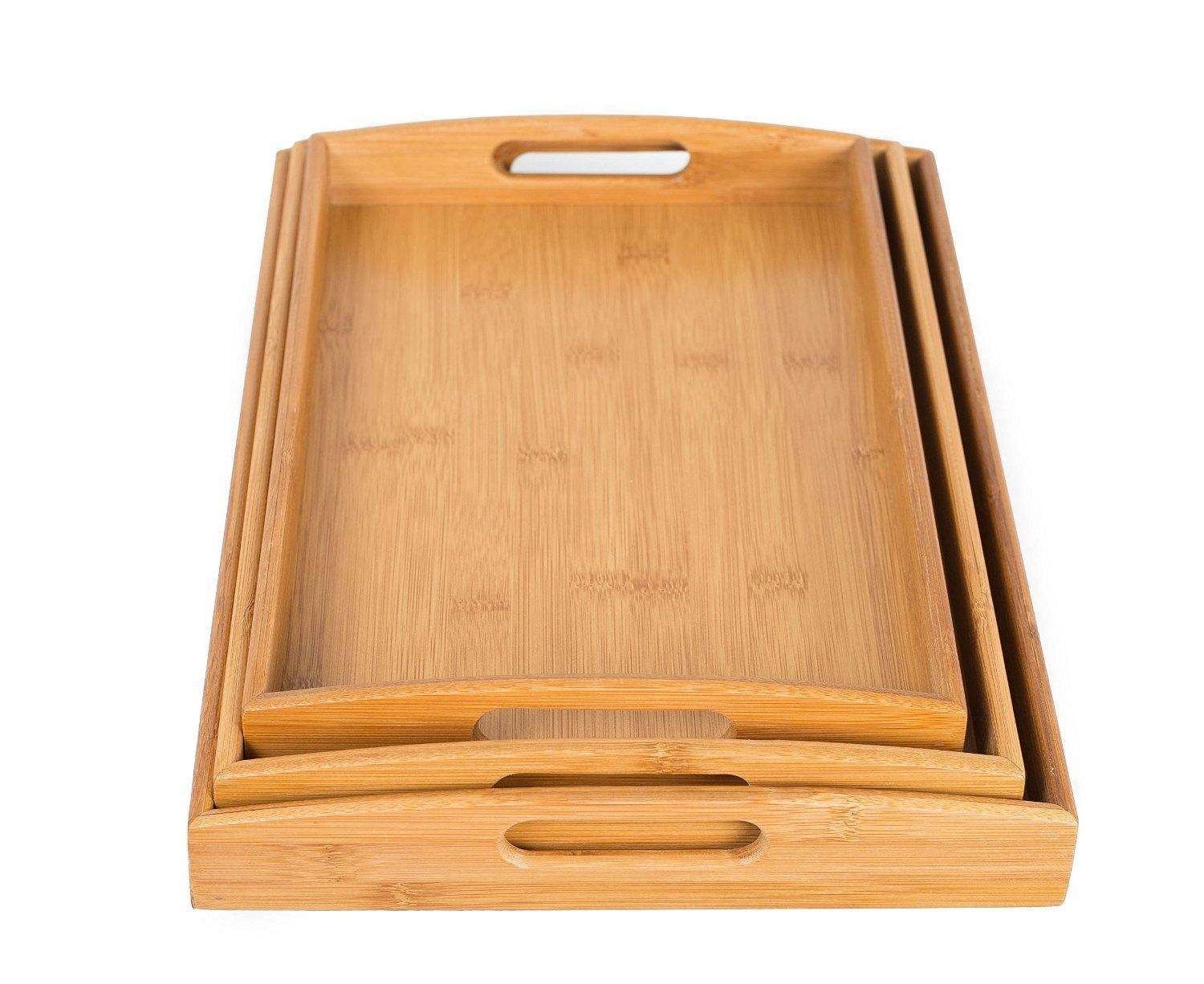 Natural Rectangle 3 Pieces Food Breakfast Coffee Tea Wood Serving Tray Set With Handles