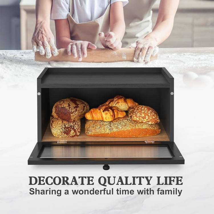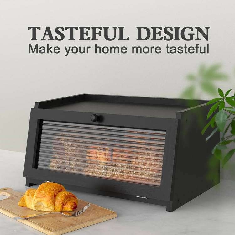 Kitchen Countertop Large Capacity Bread Holder Food Storage Bin Black Bamboo Loaf Bread Box With Window