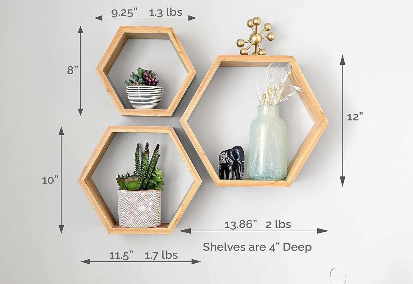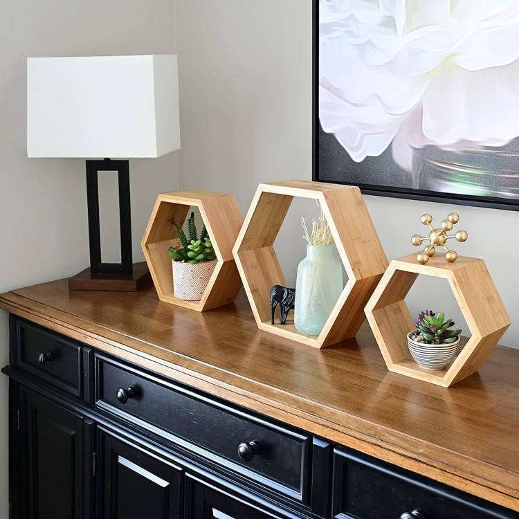 Home Decorative Set Of 3 Display Storage Hanging Bamboo Wooden Wall Mounted Hexagon Floating Shelves For Bedroom Living Room