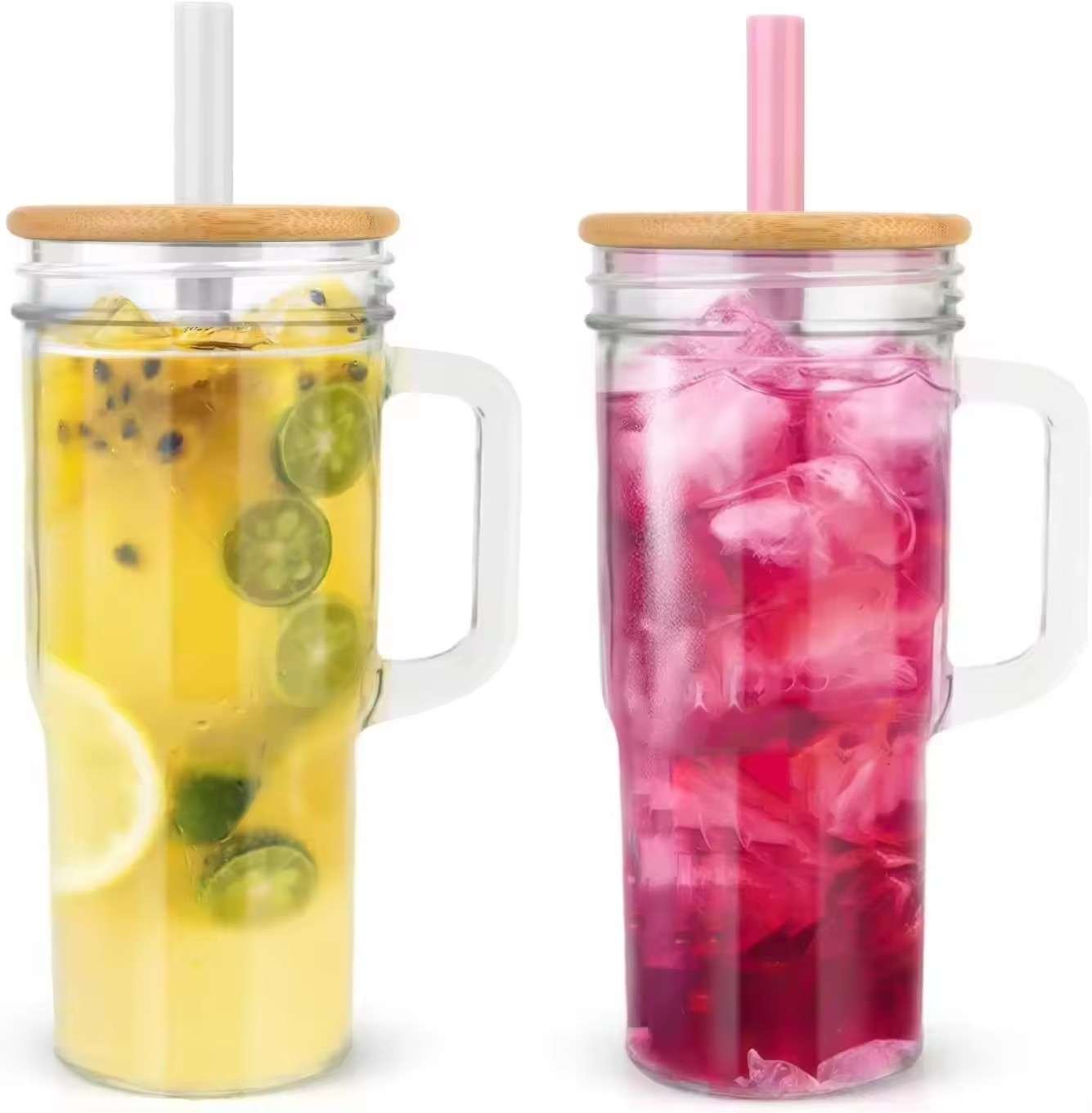 wholesale Glass Drinking Tumbler with Bamboo Lids and Straw Water bottles with handle Beer Can Shaped Cups Coffee Beer Glass