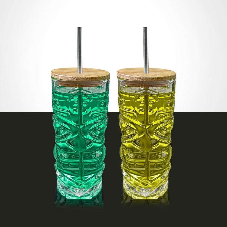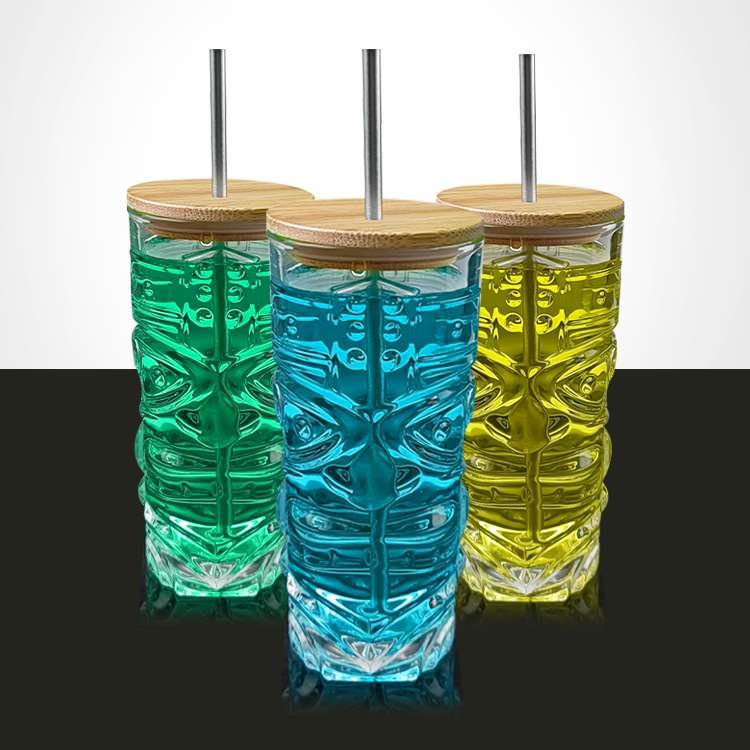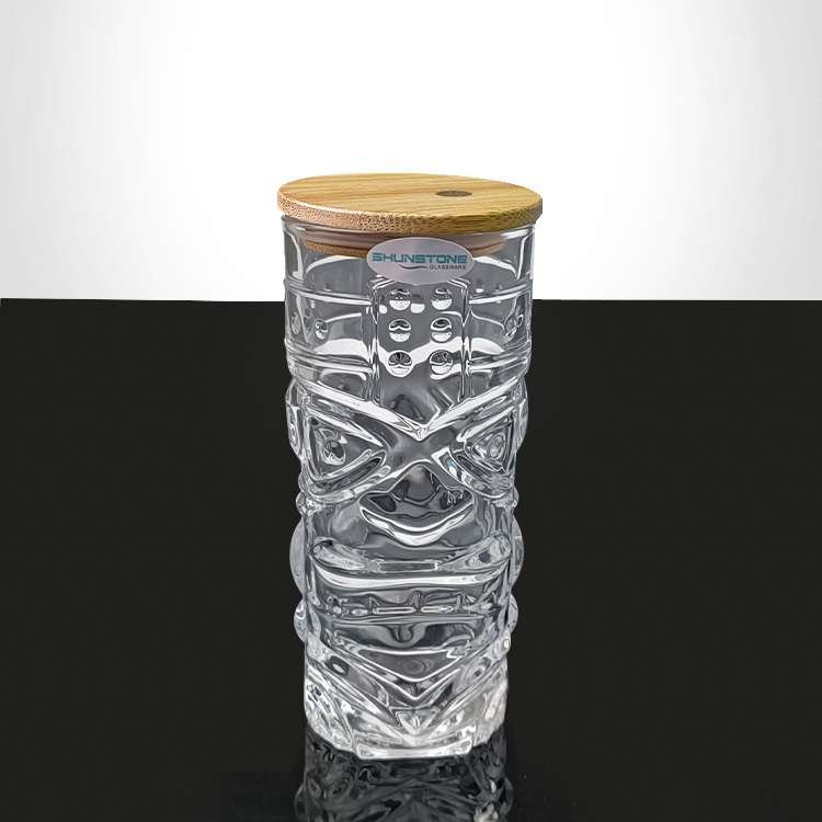 Custom Glasses With Bamboo Lid Water Drinking Tiki Cocktail Glass wholesale manufacturer, Creative Clear Crystal Unique Tiki Shape Beer Can