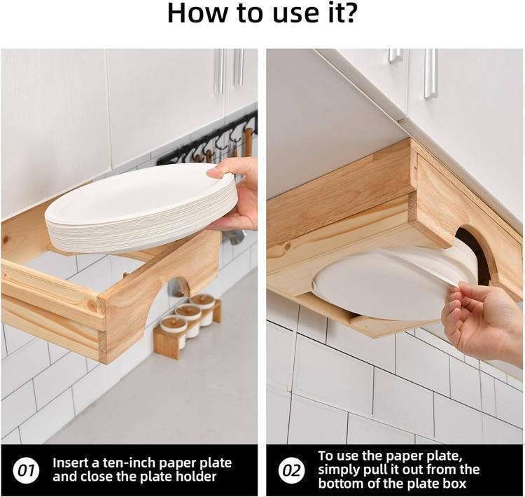 Under Cabinet Wood 10 Inch Plate Holders Wall Mount Vertical Paper Plate Dispenser For Kitchen Counter