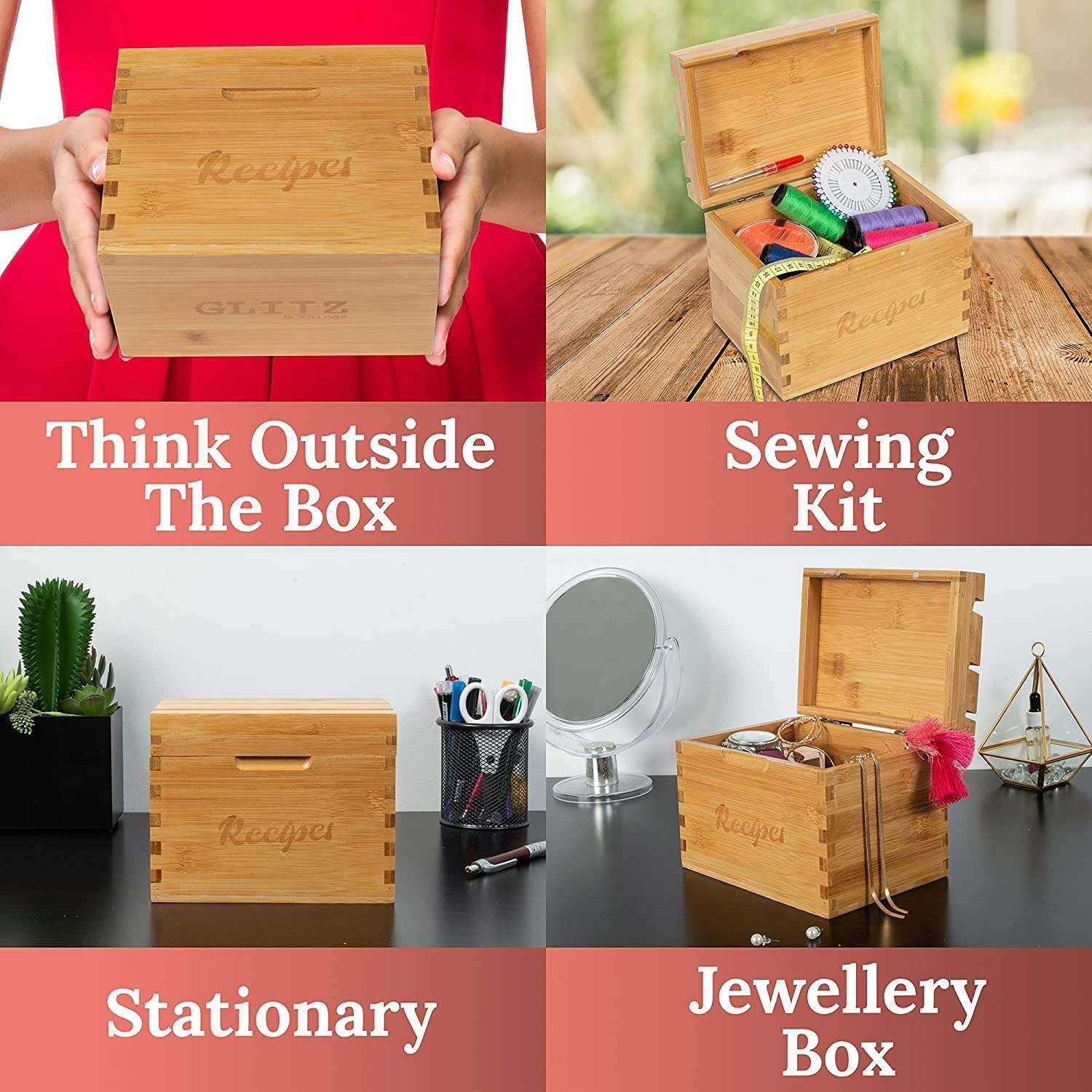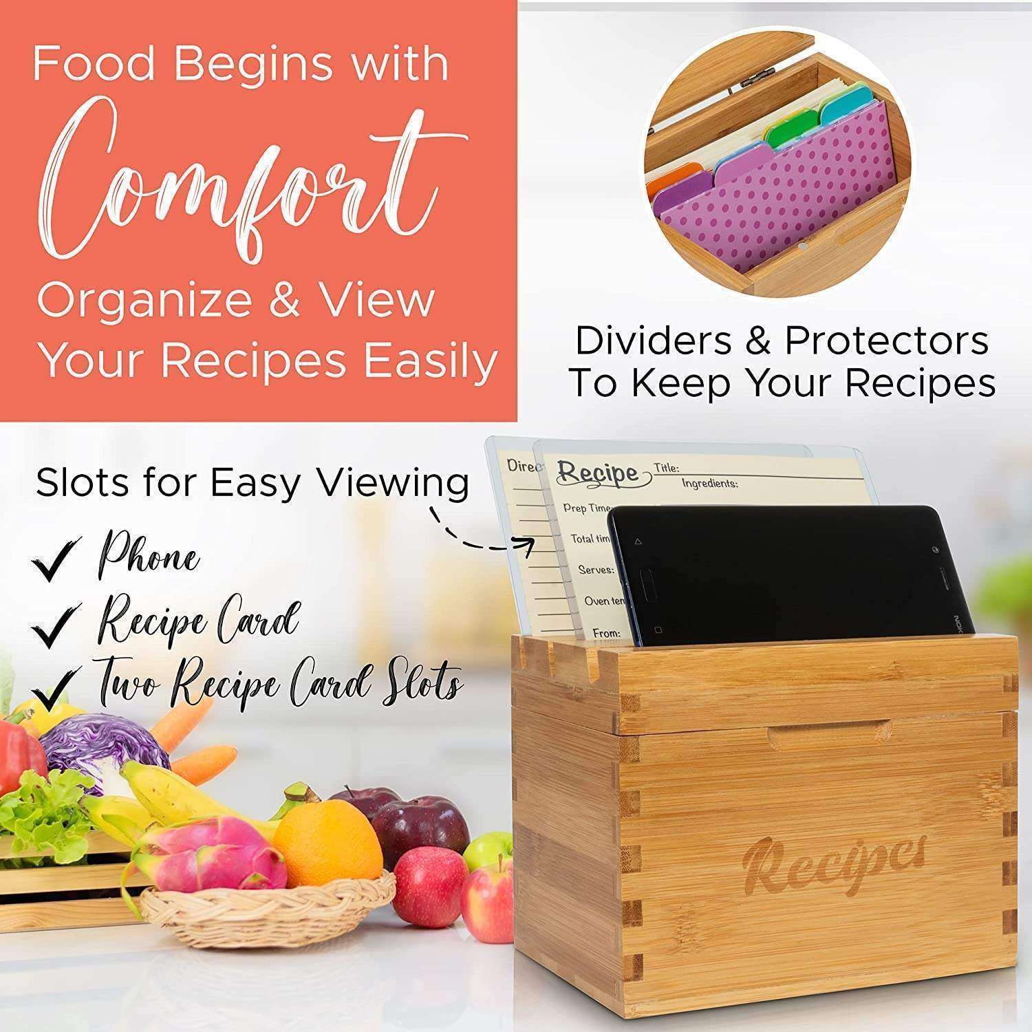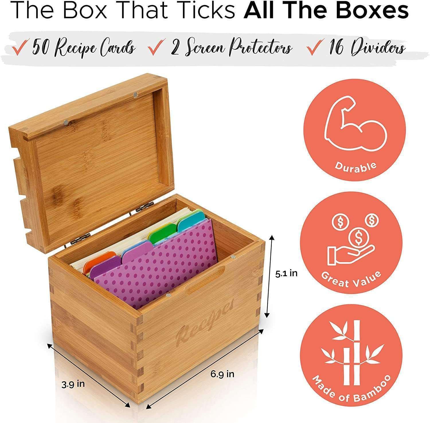 Wholesale Bamboo Recipe Card Box Wood Recipe Box With 16 Dividers, 70 Recipe Cards, and 2 Protective Sleeves