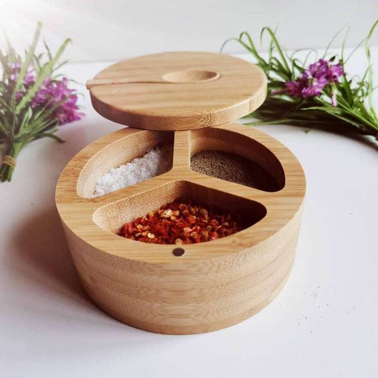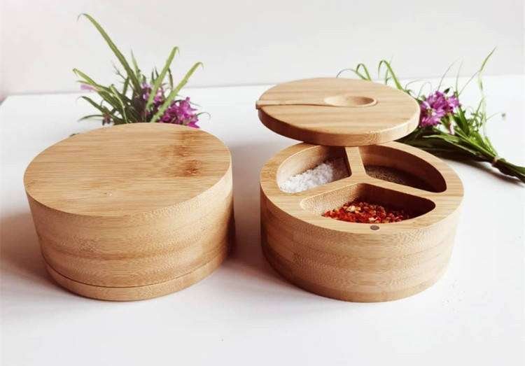 Modern Pantry Organizers And Storage Round Dry Food Container Sugar Salt And Pepper Bamboo Box With Lid And Wooden Spoon