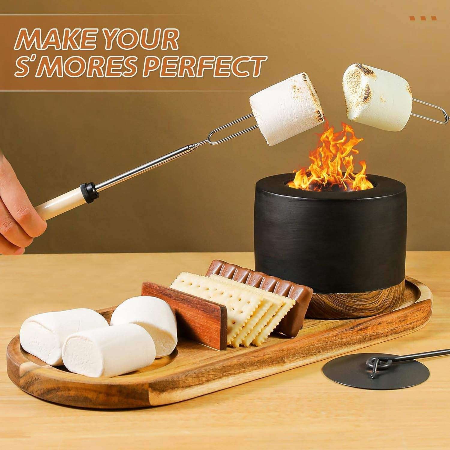 Indoor Smores Kit with 4 Roasting Sticks,Tabletop Smores Maker with Acacia Wood Tray,Tabletop smores firepit with Fire Pit Bowl