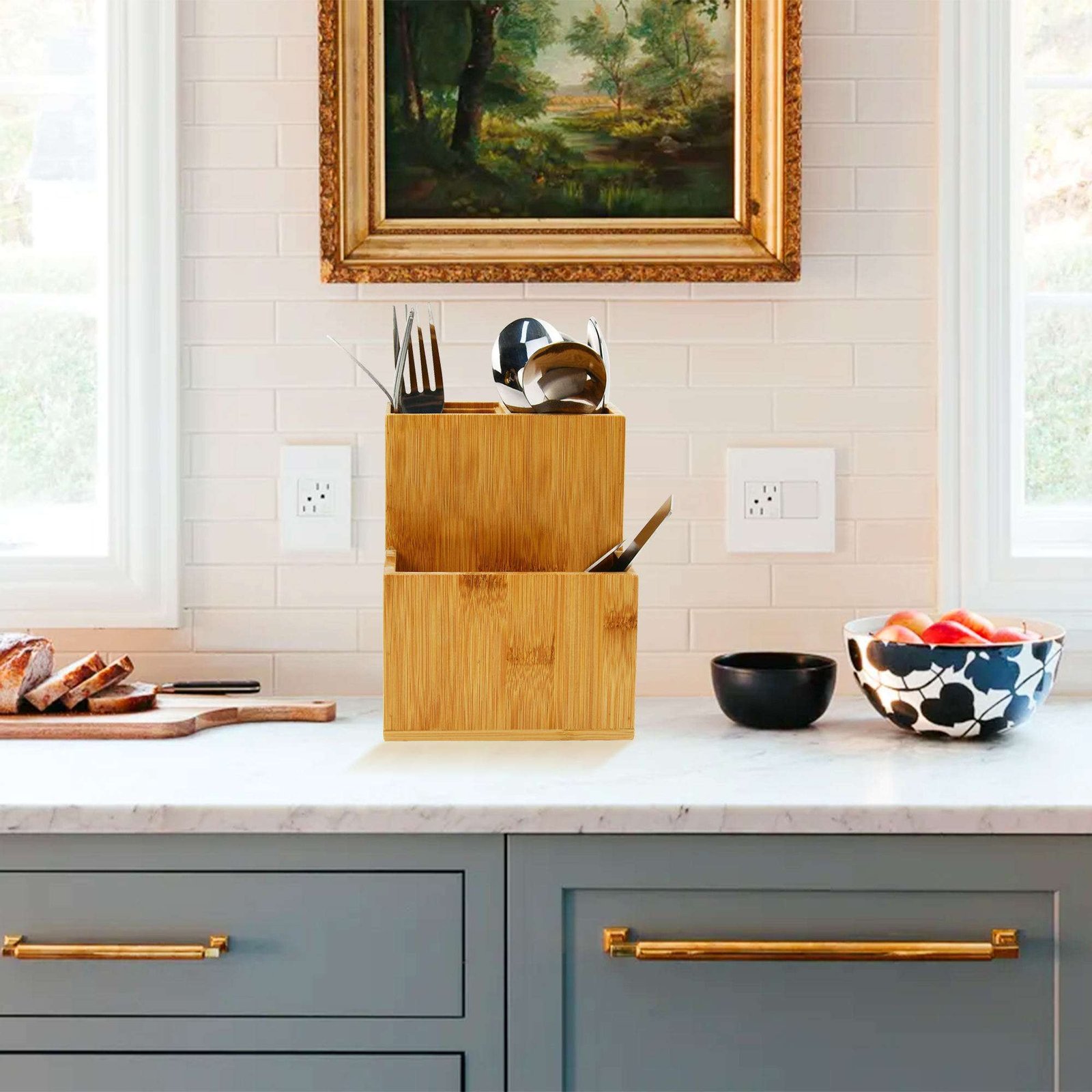 Wholesale Bamboo Kitchen Cooking Utensil Set with Holder Storage 2 Compartment Multipurpose Flatware Caddy for Spatulas and Spoons
